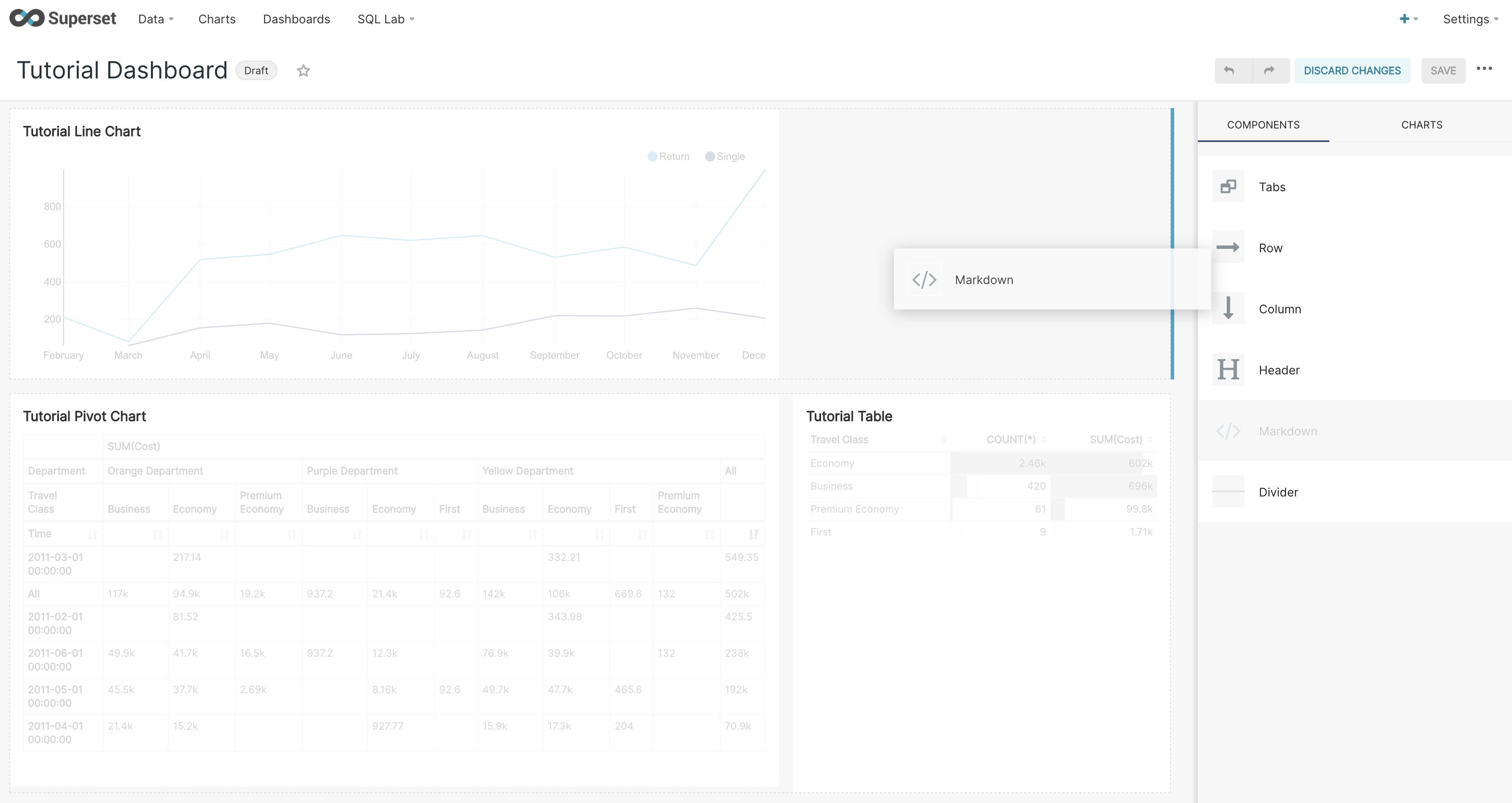 You should see months in the rows and Department and Travel Class in the columns. Publish this chart to your existing Tutorial Dashboard you created earlier.